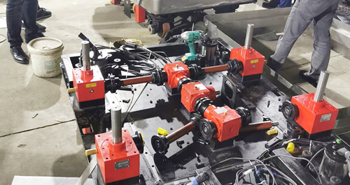 多臺聯(lián)動絲桿升降機平臺,電機在中間,電機連接轉(zhuǎn)向箱或者K系列減速機,在通過連接桿和···